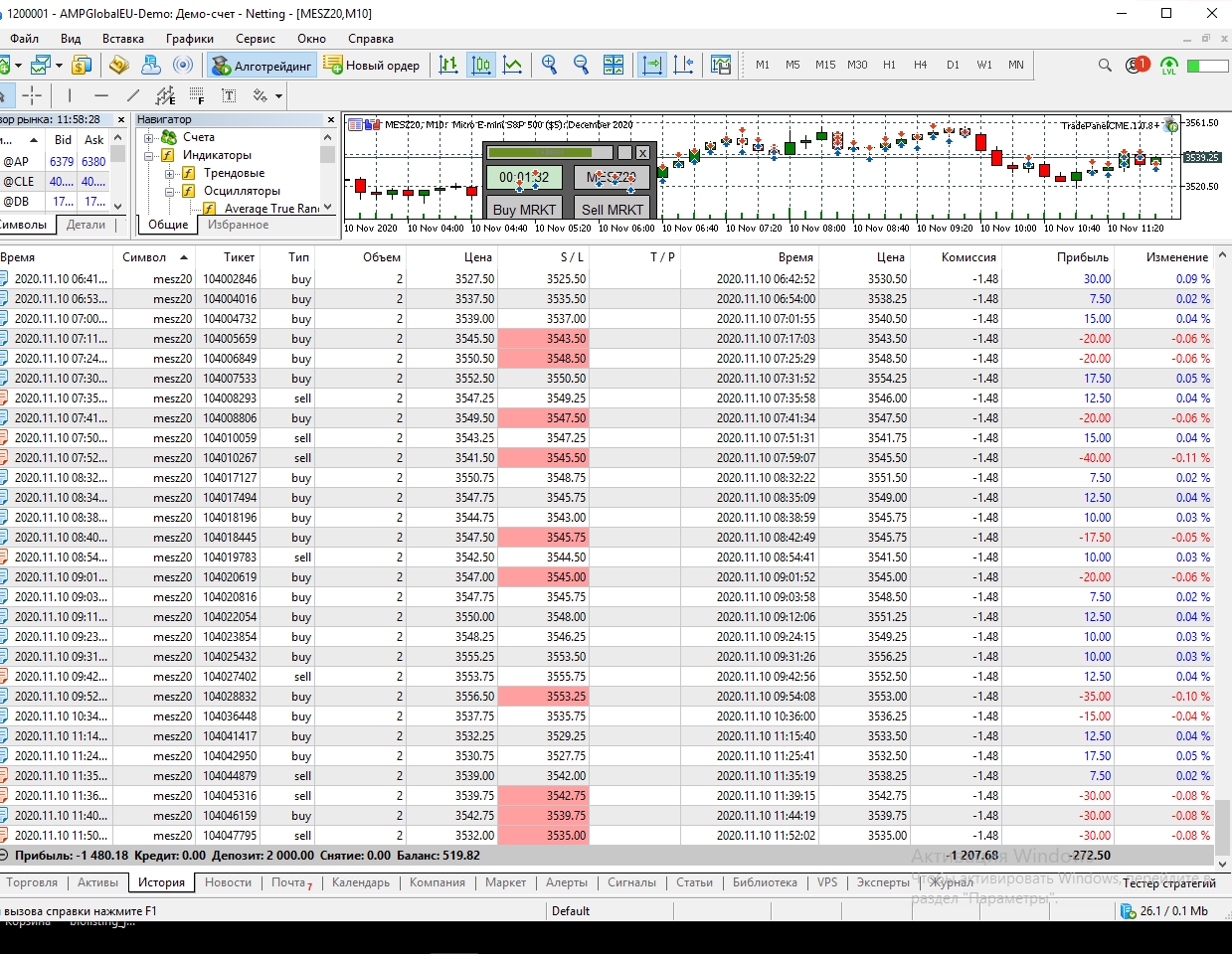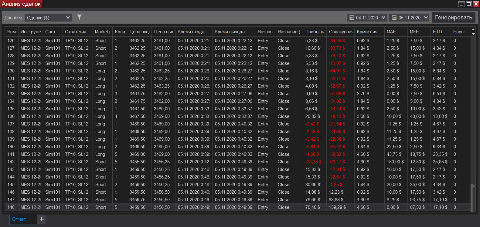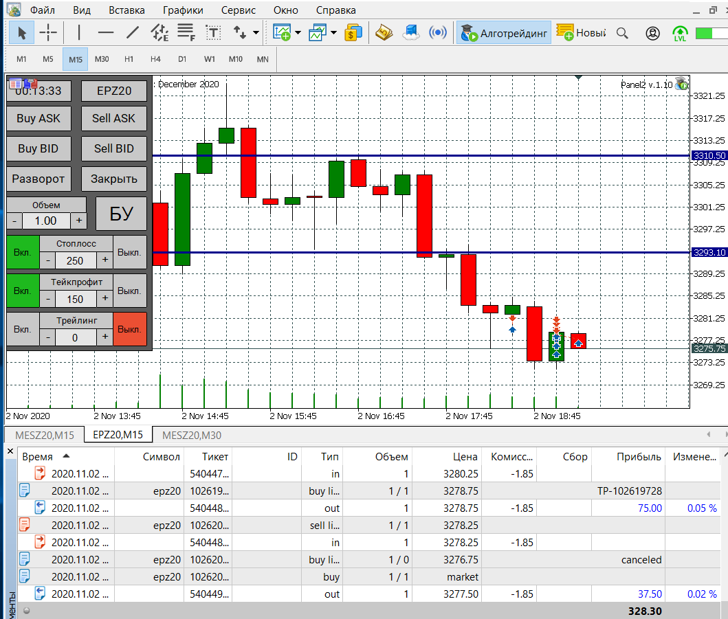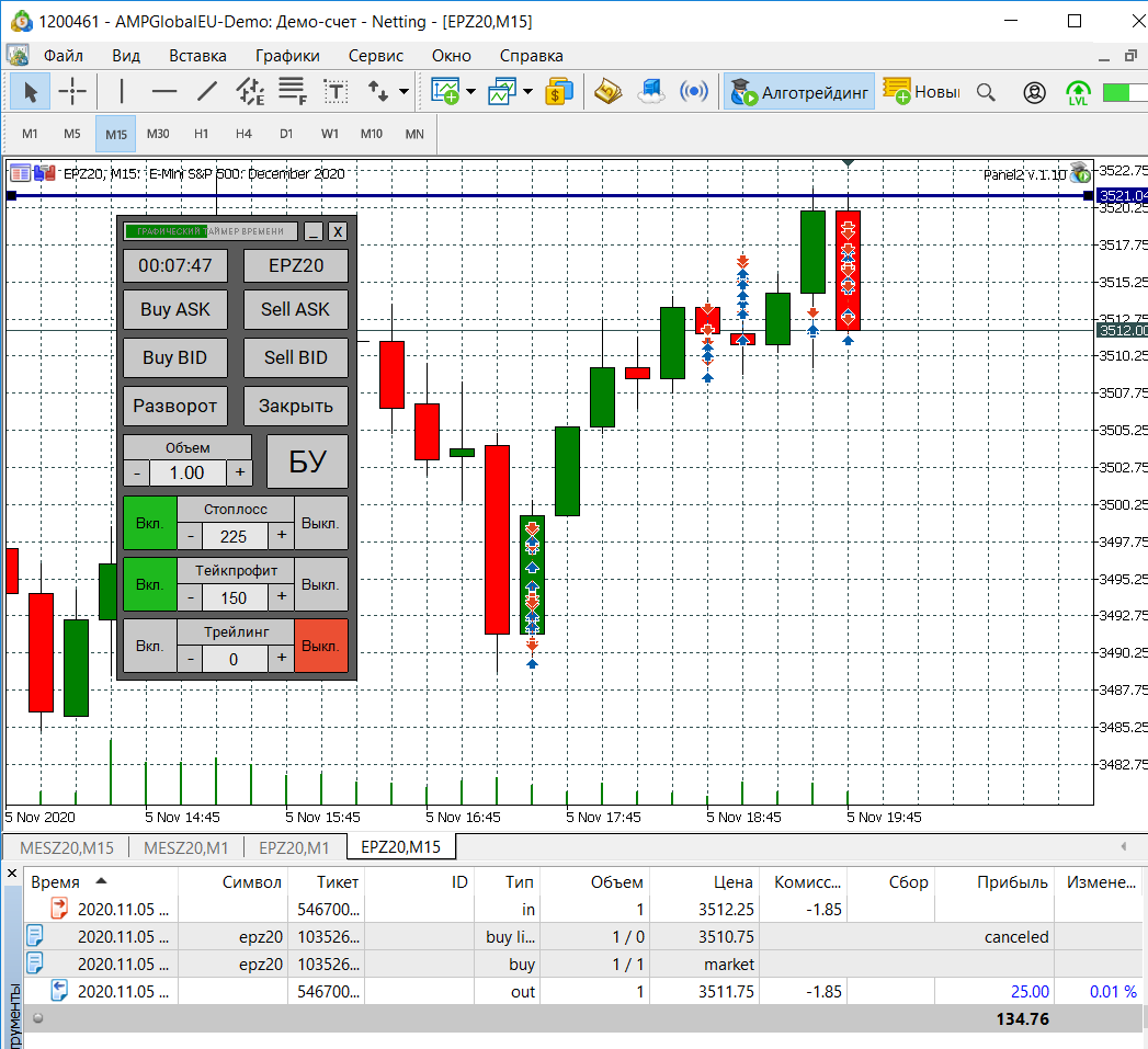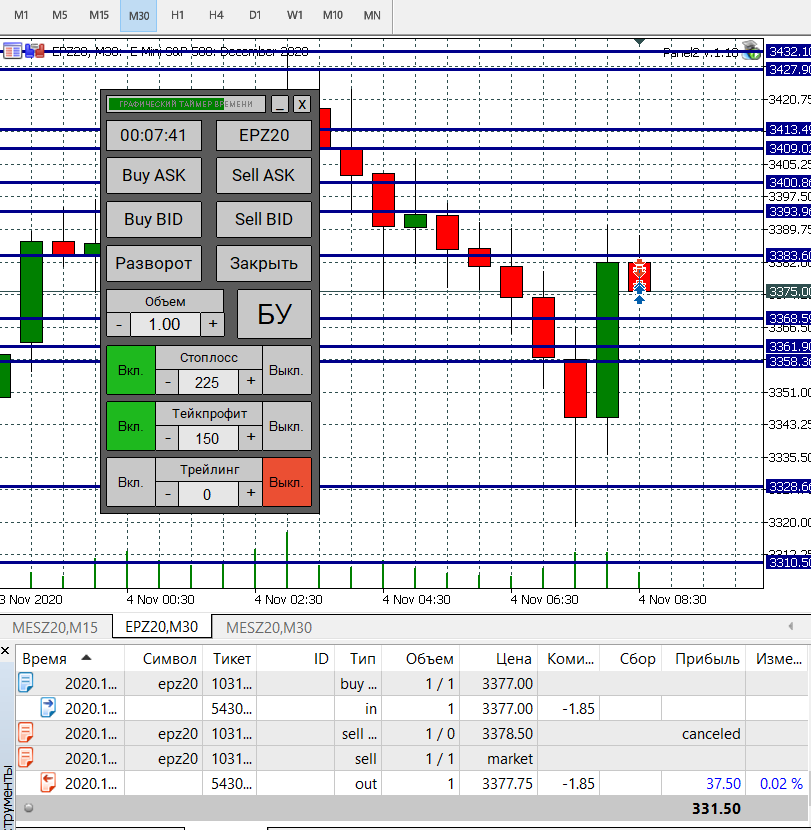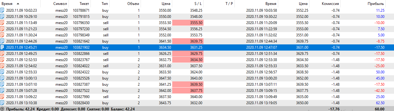 Сегодня попал на сильную волотильность и на метание цены вверх-вниз, что привело к большому минусу, но работал строго по стратегии, старался не входить в сделку когда появлялись сомнения, чувствуя, что большой стоп-лосс (12) хорошо меня придушил увеличил количество лот до 5. В итоге все же уверенно вышел в плюс.