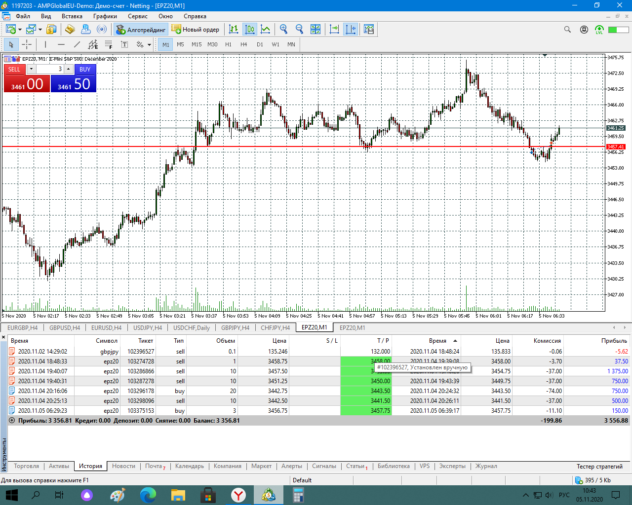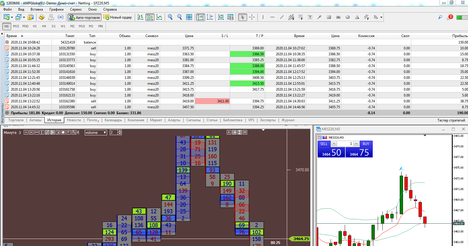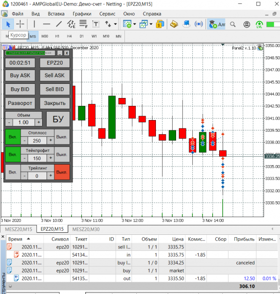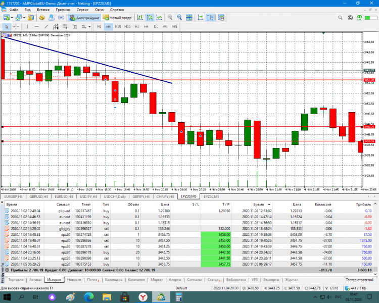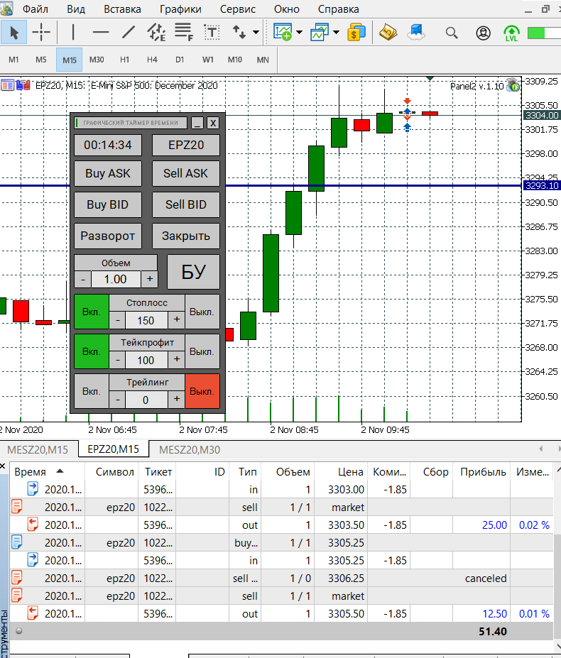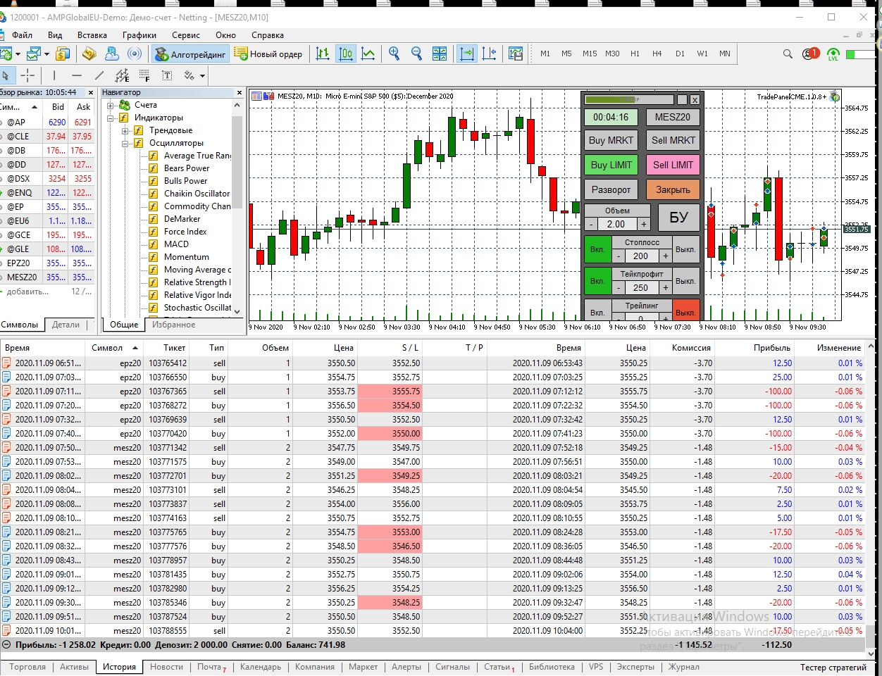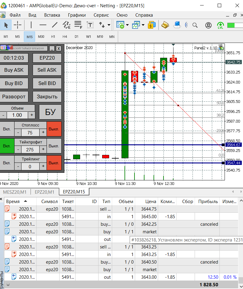 Сегодня попал на сильную волотильность и на метание цены вверх-вниз, что привело к большому минусу, но работал строго по стратегии, старался не входить в сделку когда появлялись сомнения, чувствуя, что большой стоп-лосс (12) хорошо меня придушил увеличил количество лот до 5. В итоге все же уверенно вышел в плюс.