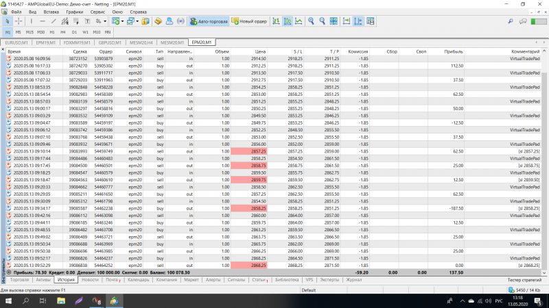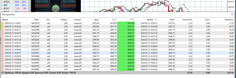 Торговля 13.05.2020. Решил изменить своей привычке торговать после открытия Америки. Начал торговлю гораздо раньше. Рынок был вялый, никак не мог войти в колею, входил в сделки не вовремя, потом не заметно попал под новости, которые хорошо потрепали и я влетел до -77$. После окончания новостей, при открытой Америке почувствовал себя уверенно и выплыл до +24$. Всего сделал 60 сделок, 20 убыточных (33%), из последних 10 сделок всего 2 с минусом. Глядя на успехи Ларисы, есть к чему стремиться. Лариса МОЛОДЕЦ!