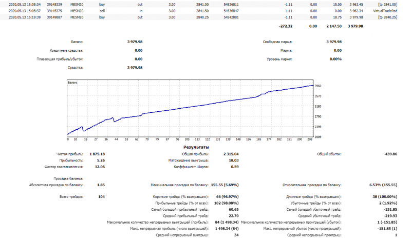 С 6 мая по сегодняшний день было 104 сделки из них 2 в минус!