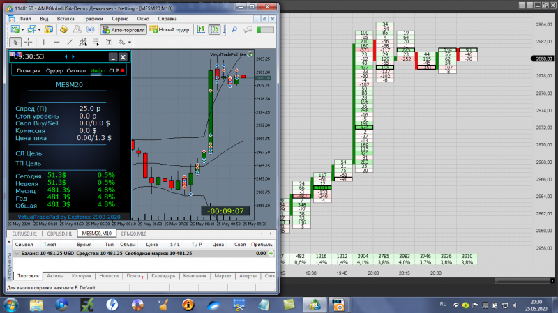 Олег Коломацкийнаписал25 мая 2020 в 11:56Рынок стоял все утро почти и немного сейчас выстрелил. Сделки прикрепляю. Пока +325$. Больше не буду торговать, так как сегодня праздник в США! Просьба к Евгению прокомментировать скрины 1, 3, 6!