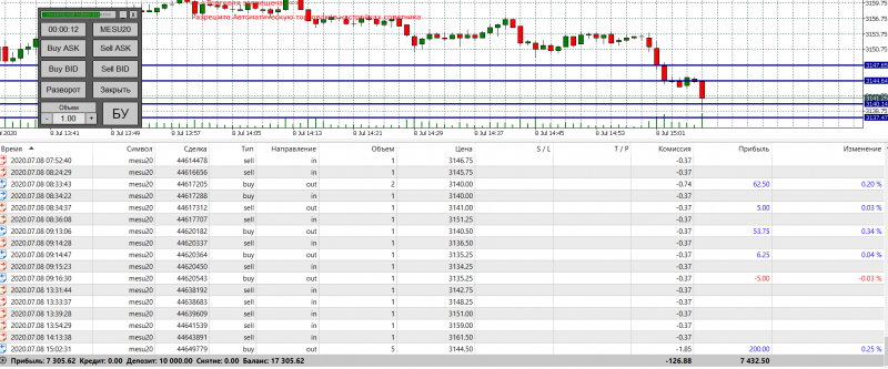 Булат, отличный результат. У меня нервозно шли сделки на Европе/Азии: цена еле ходит. На открытии Америки, все как всегда прозрачно и удачно! Я уже подумываю, чтобы торговать не больше часа в день с 16.30 до 17.30 МСК! Как Александр - несколько сделок и все! Чем сидеть весь день у монитора на неактивном рынке...