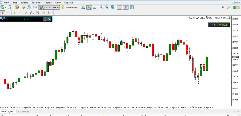 В результате торговли в течение пяти свечек выполнил 15 сделок (11 в плюс и 4 в минус, то есть 73% успешных). Старался до стоп-лосса не доводить, порой выходил раньше. В итоге чистая прибыль +42,65$ на микроконтракте.