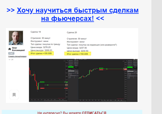Лариса, я с удовольствием показывал бы свои сделки. Но не хочу портить экибану, общую картину. У меня пока день за днём выходит около нуля или в минусе. Уже отчаяние начинает подступать, но надеюсь прорваться. Ваши фантастические результаты как свет в конце длинного тоннеля!