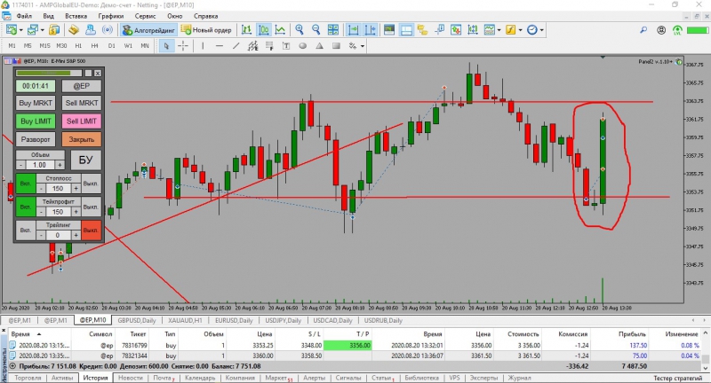 Евгений, вот теперь всё устаканивается в голове. Вот сейчас, до открытия американской сессии, начал выходить пододвигая линии СЛ или ТП, смотря как себя цена поведёт. Сделал 6 сделок и результат + 132,02$. Только один раз цена пошла не в мою пользу и я пододвинул СЛ, не стал ждать и получил половину минуса от СЛ. Благодарю вас за отклик! P.S. Начал делать, как со мной поделился Олег, смотрю опять ваши уроки, сегодня импульсные сделки.