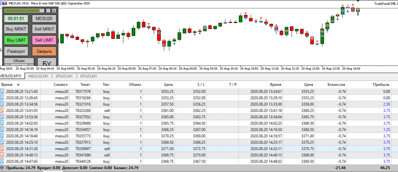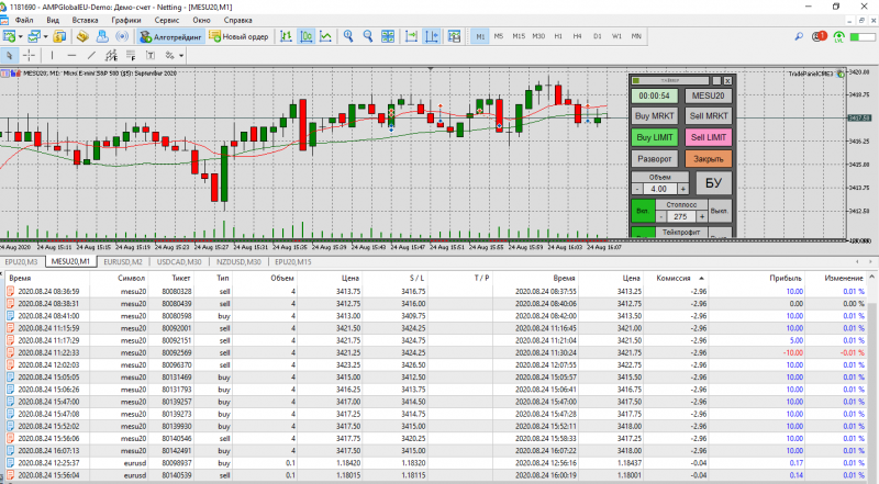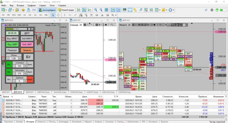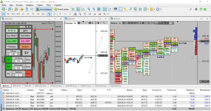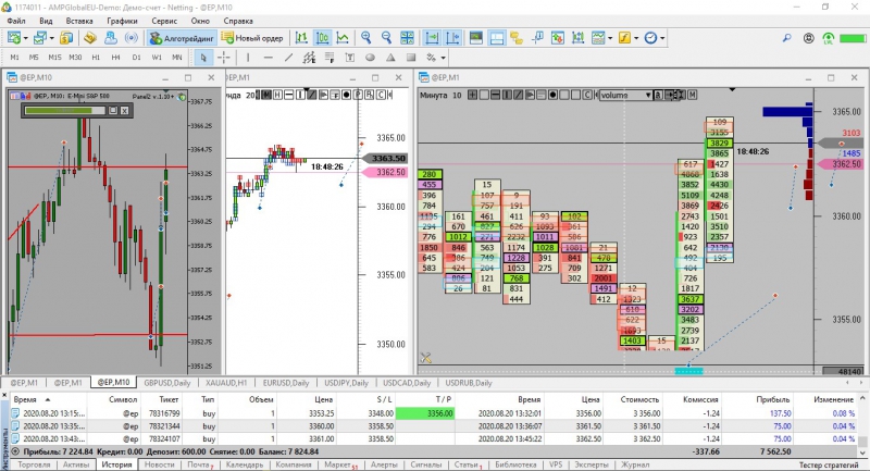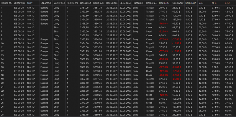 С 4-мя тиками часто день закрываю в минус, поэтому сегодня уменьшил тейк до 3 тиков. На демо счете AMP сделки отрабатывают лучше чем на реале, поэтому параллельно вел торговлю на NT8. Результат на NT8 +$212. Не мог найти как сделать чтобы в NT8 результат сделок выводился уже с вычетом комиссии. Может кто подскажет.