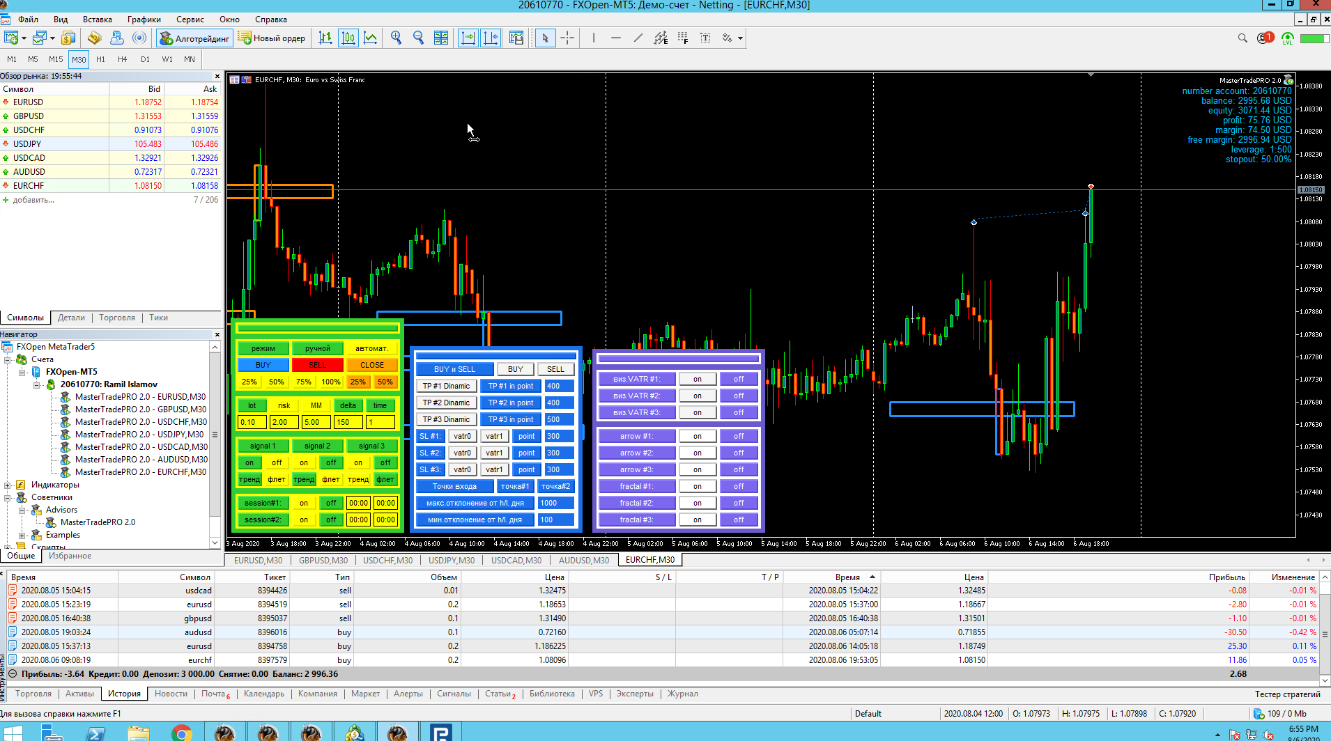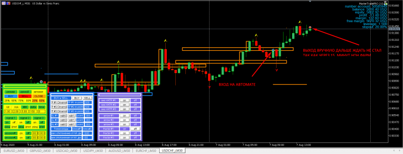 06 август 2020г  алерт по евро/франк на покупку: вошел вручную. Итог: прибыль +11,86$  Лот 0,2 вход- 1,08096  выход- 1,08150