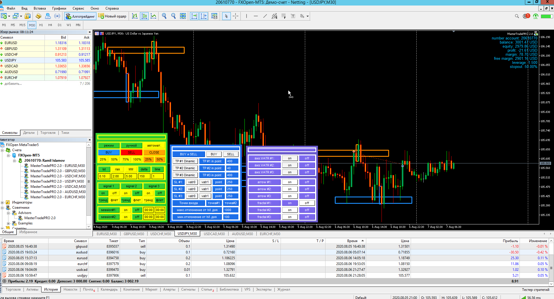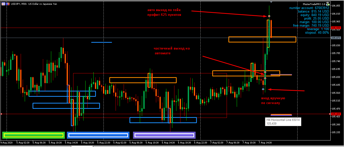 06 август 2020г   Алерт по usd/jpy на продажу,  вход вручную с переходом на автомат. Итог: прибыль  +5,21$ Лот 0,1 вход-105,632   выход- 105,577