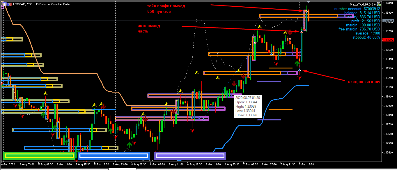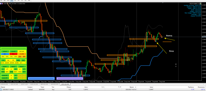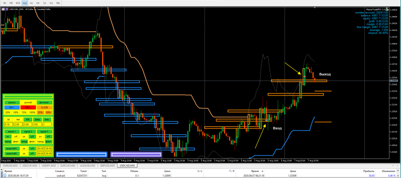 06 август 2020г Алерт по usd/cad на покупку, вошел вручную с переходом на автомат!! Итог: прибыль +1,02$  Вроде лот не трогал вообще почему то лот стал--0,01 вход-1,32791  выход- 1,32927