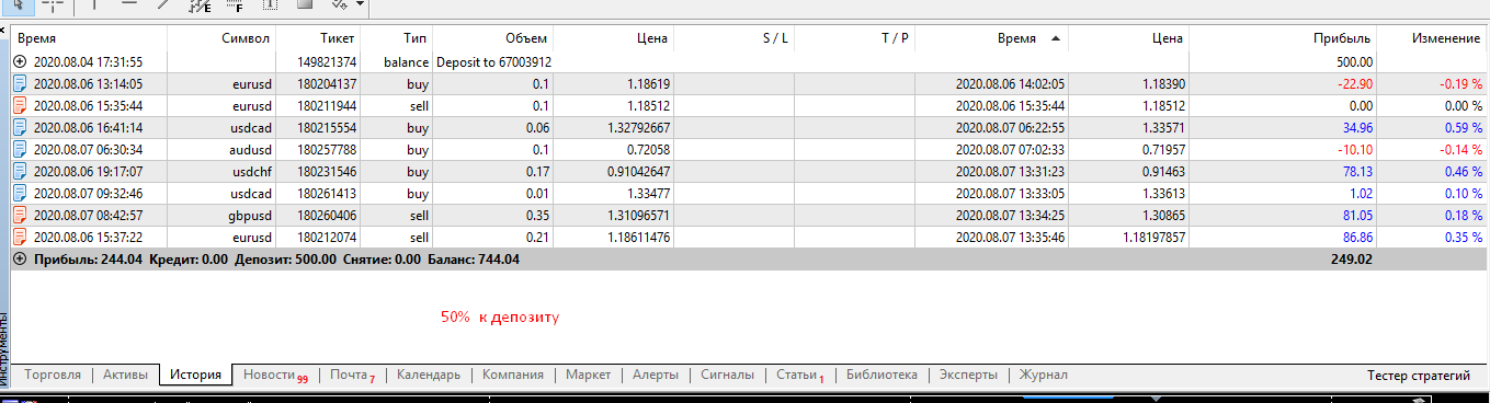 сделал депозит 500 долларов так как реальный на больше не смогу открыть .хотел максимально приблизить к реальности.но заходил не правильными лотами по настройкам по умолчанию.по хорошему с таким депозитом соотношение и риски на сделку должны быть другими
