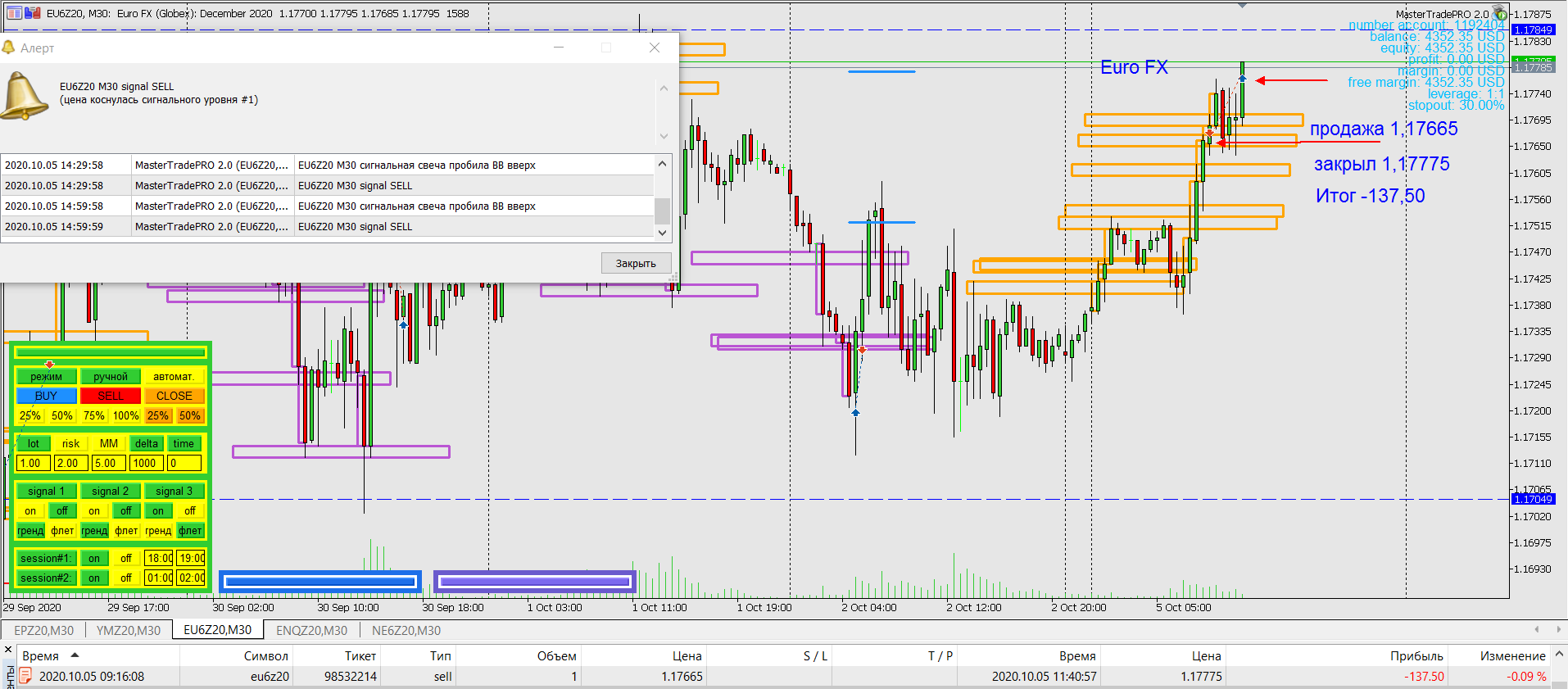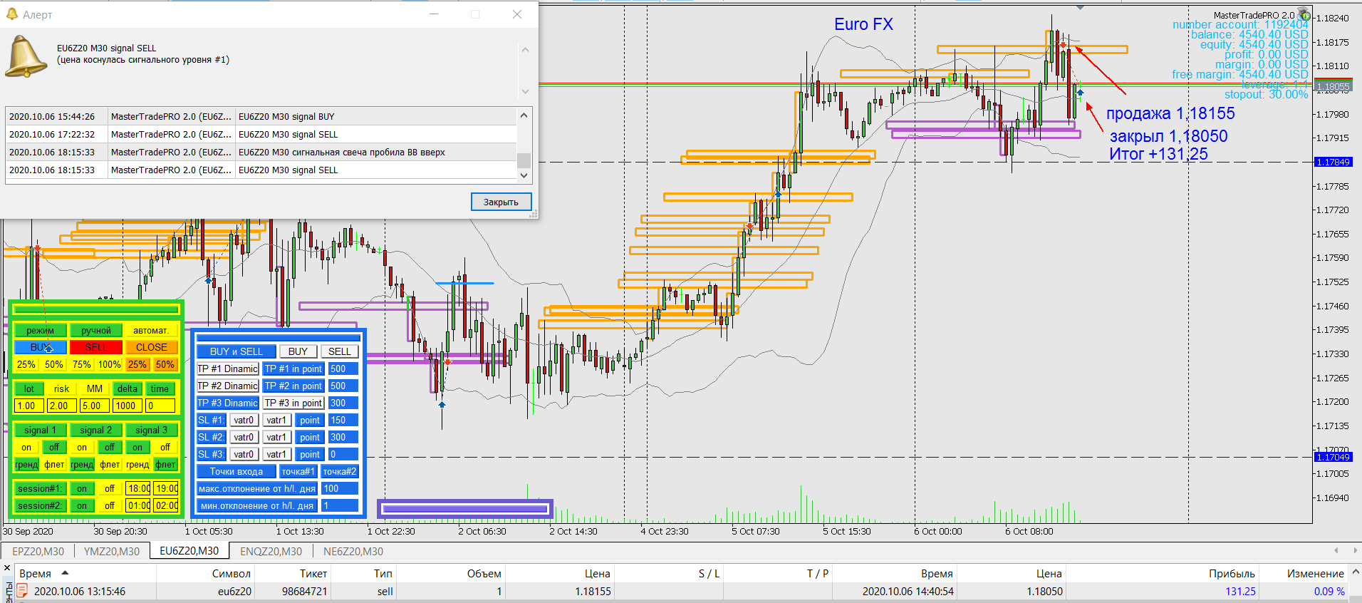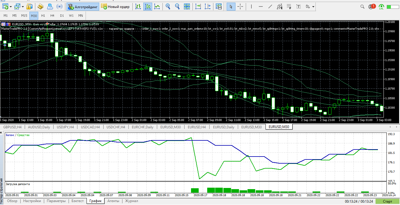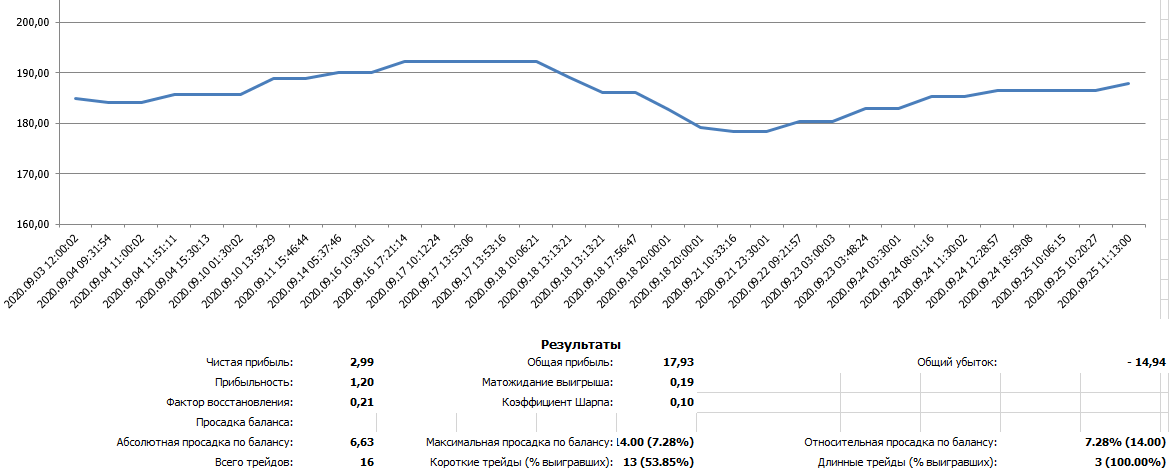 Александр Кольцовнаписал5 октября 2020 в 20:06С самого первого торгового робота, приобретённого мною у Евгения Стрижа, BalansMarket меня интересует автоторговля. Для ручной торговли у меня сильно хромает психология и просто не хватает свободного времени. Сейчас меня волнует разница в результатах тестов и реальной торговли. Поэтому со 2 сентября по 25 сентября 2020 на небольшом депозите у Альпари поторговал непрерывно комбинированной автостратегией EURUSD 30M.v2 + 4H.v3. В результате реальная торговля оказалась эффективнее тестовой: