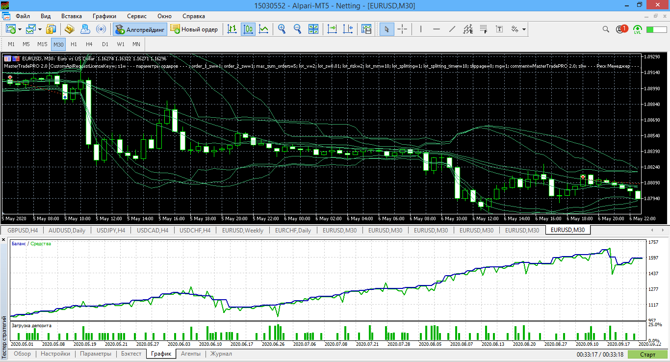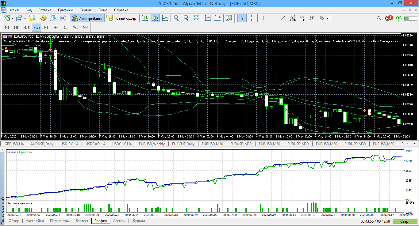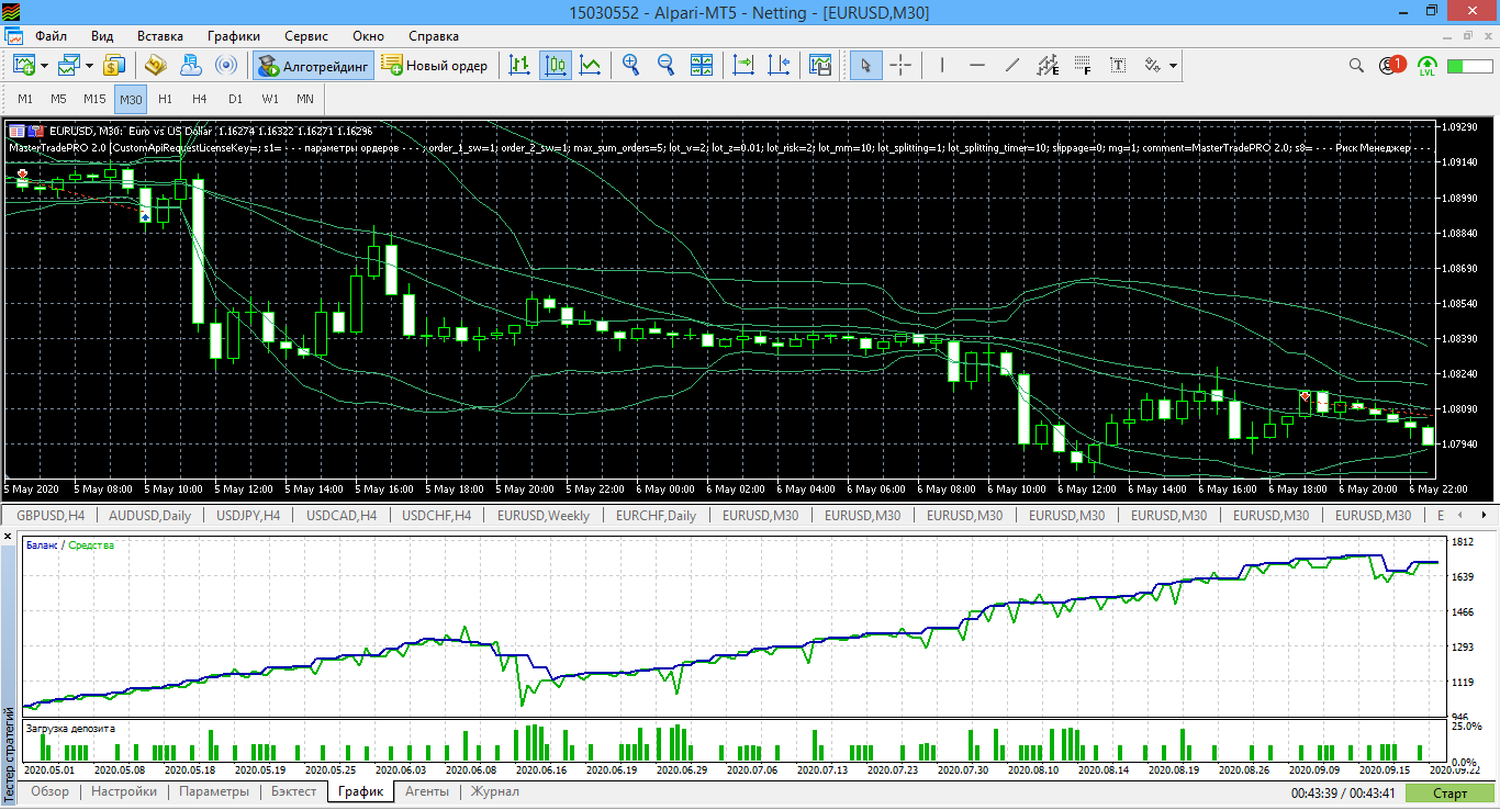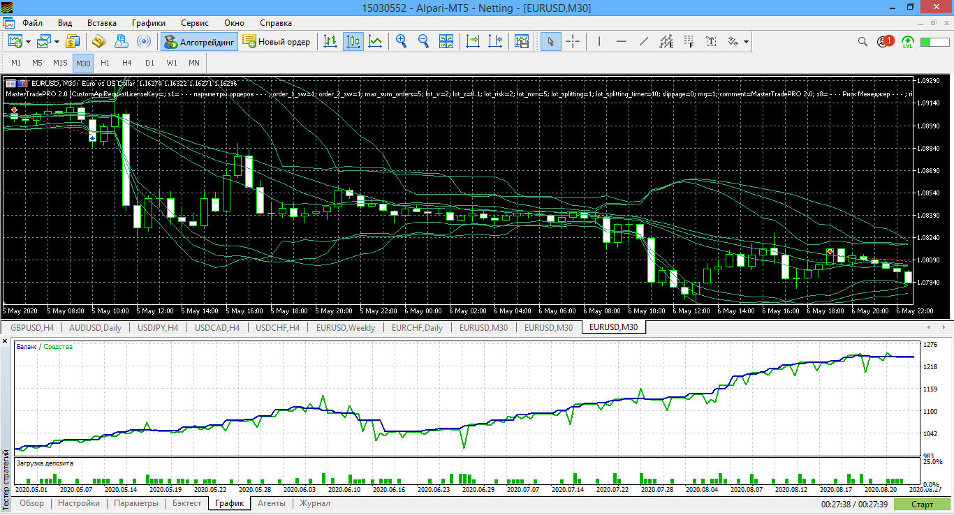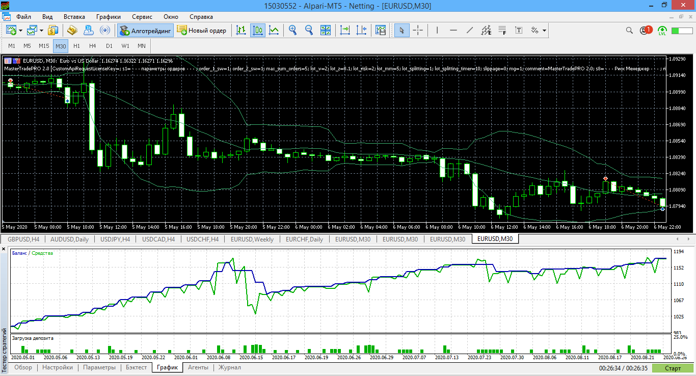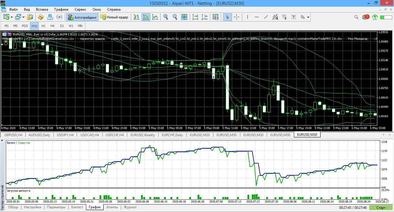 Протестировал также на МТ5 Альпари за последние 4 месяца с 1 мая до конца августа все варианты автостратегий для MasterTradePRO2.0 В итоге для скальпинга М5 и среднесрока Н4.v2 у меня получился неудовлетворительный тест. Пробовал в августе на реале торговать эти автостратегии на М5 и Н4, но за 10 дней ушёл в существенную просадку и отключил автоторговлю.