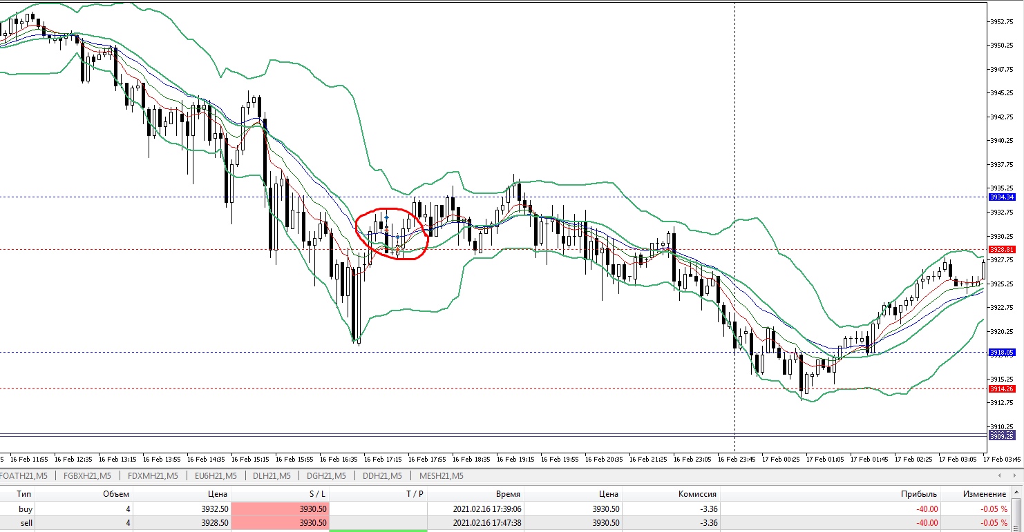 Скрин 1 показывает общую картину на свечном графике 5m.