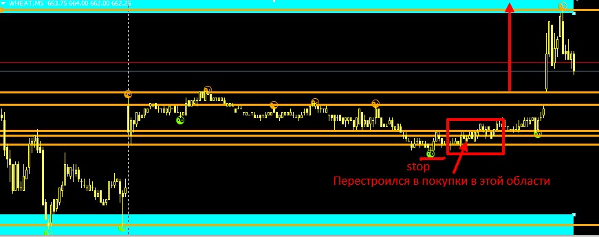 А вот пшеница не смогла удержаться на уровне 665.30,после чего второй вариант отработал, цена пробила и протестировала область с последующим движением)