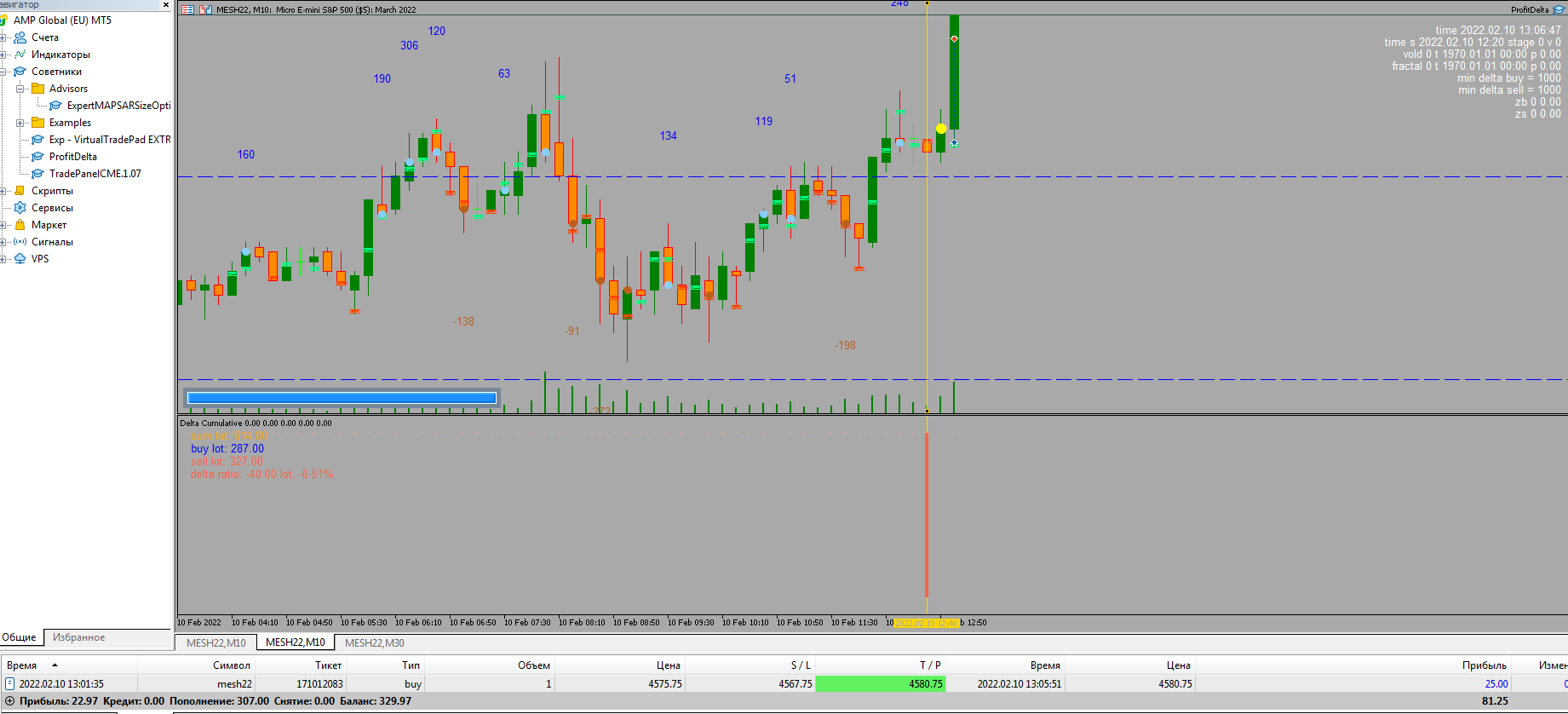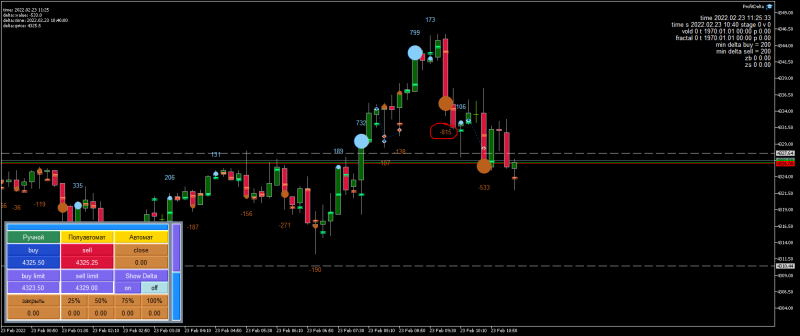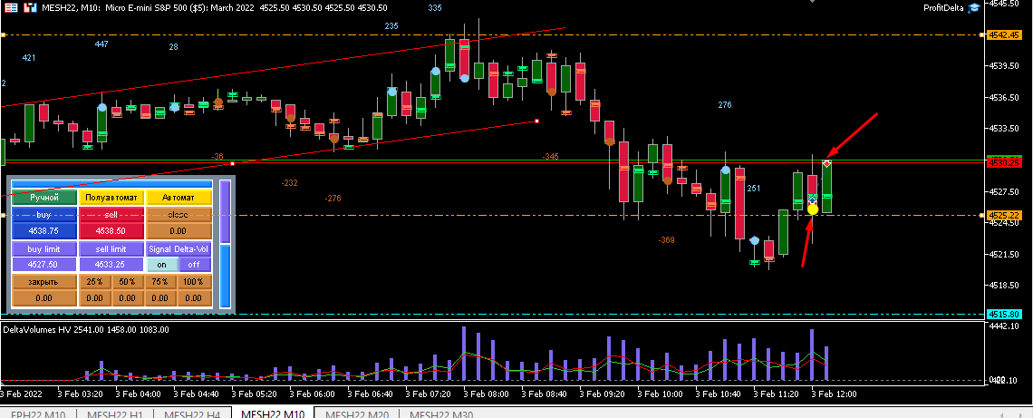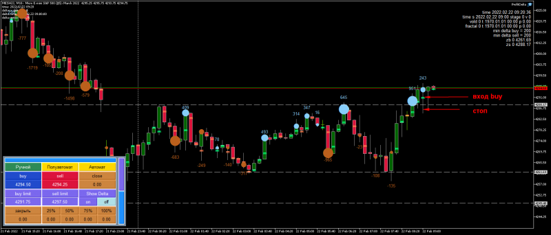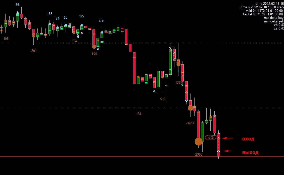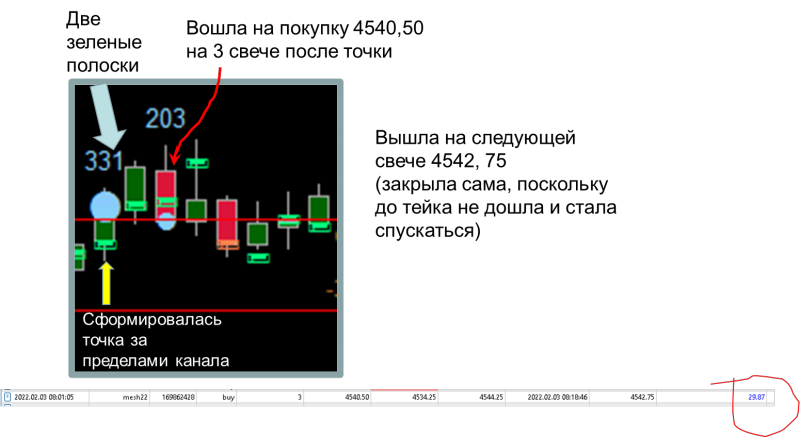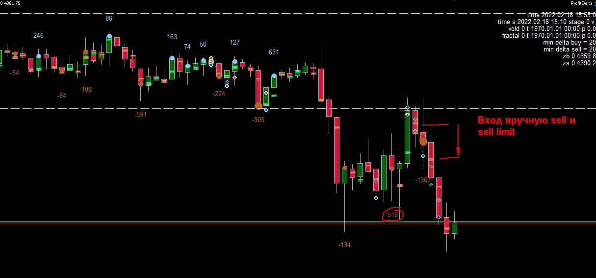 После выхода из зоны накопления, дождался ТТ (-518), 2 полоски красные, 1 зелёная, вошёл вниз двумя сделками (sell и limit).