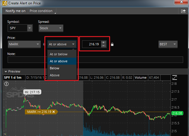 Потренируйтесь на минутном графике SPY, выставляя алёрты очень близко к текущей цене. Чтобы сразу увидеть, как они срабатывают.