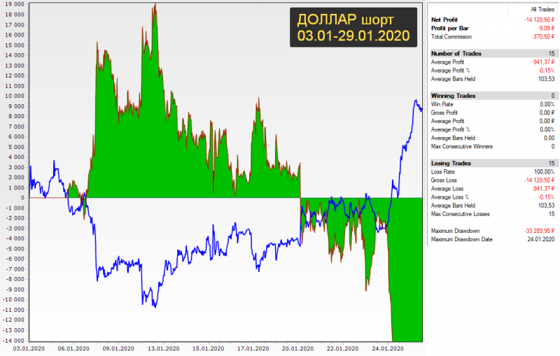 Сначала лонг давал просадку 3000 руб., а шорт зарабатывал 19000 руб., но под конец месяца ситуация изменилась. Лонг вышел из просадки в прибыль 51650 руб., а шорт растерял прибыль и ушел в просадку 14000 руб.