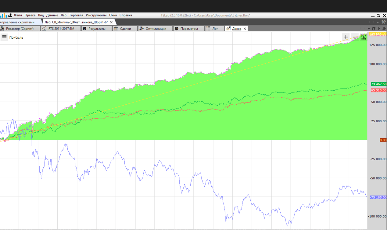 - в описанной выше стратегии которую я использовал - портфель формировался так, что прибыльные стратегии складывались таким образом - чтобы общая кривая доходности получилалась с наименьшей волатильностью и с наибольшей прибылью.