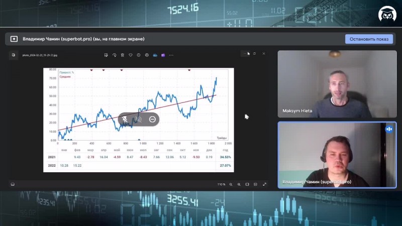 Дорогой друг, смотрите запись интервью с учеником. Его зовут Максим, он торгует трендовыми роботами с 2021 года.